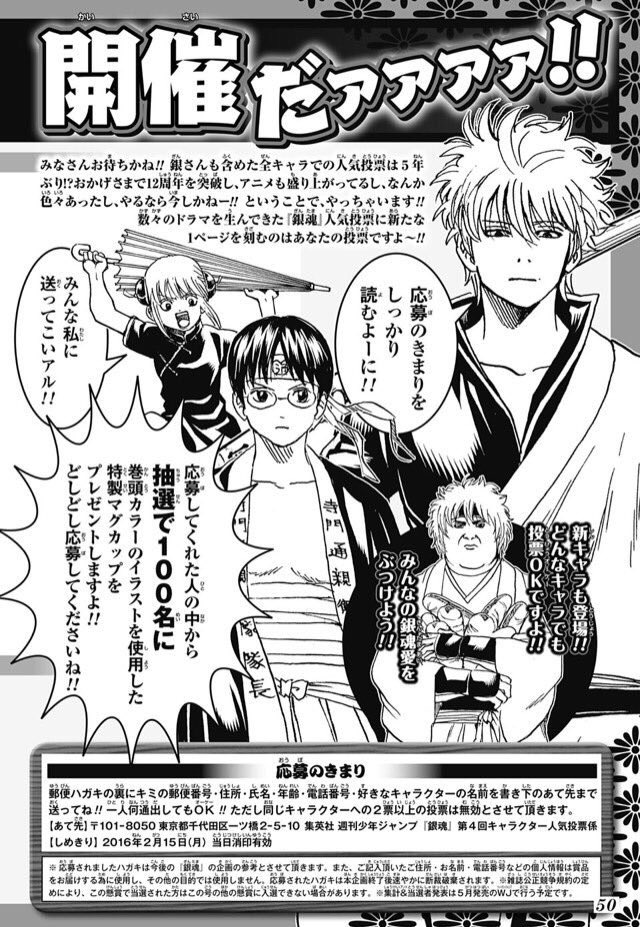 Ginria 銀魂とともに V Twitter 第4回銀魂キャラクター人気投票 締め切り 2 15 宛先と葉書裏に 住所 電話番号 年齢 好きな キャラクターを書いて送るだけ アニ銀派も単行本派もジャンプ派の人も是非是非やりませんか 今ここで銀魂クラスタの 魂 を届けよう